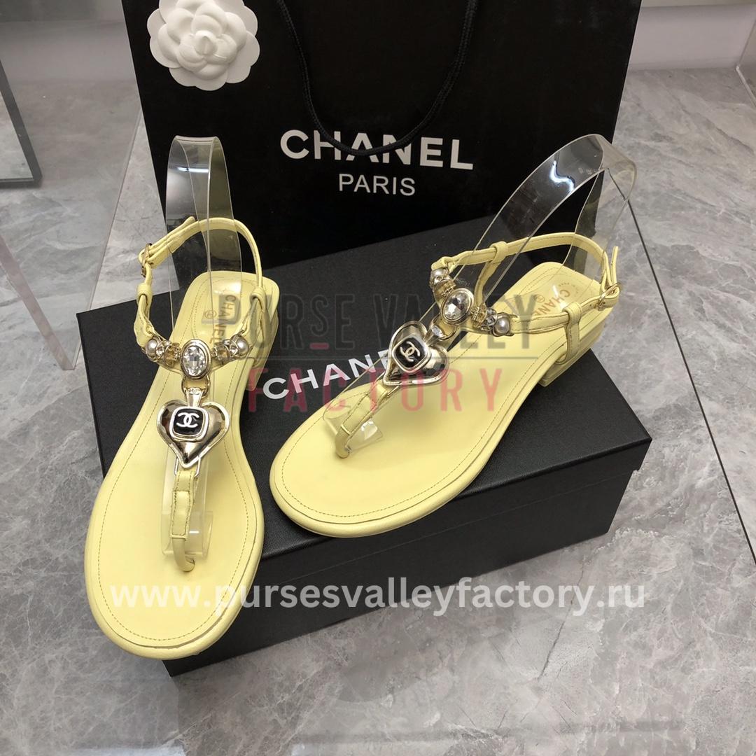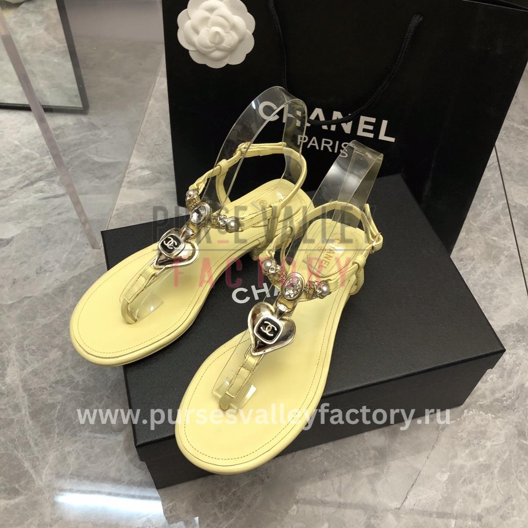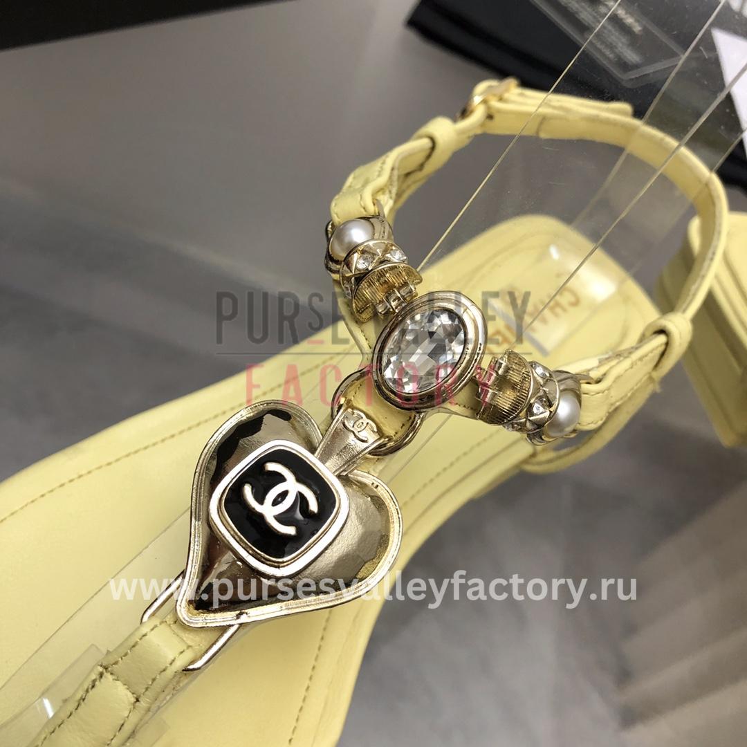- Embrace sunshine radiance with these radiant CHANEL Sandals in a vibrant shade of buttercup yellow.** Crafted from a blend of smooth and textured lambskin, they boast a chunky silhouette with a comfortable square toe and a buckled ankle strap. The iconic Chanel double C logo, playfully crafted from metallic beads, adds a touch of shimmering brilliance to the sunny backdrop.