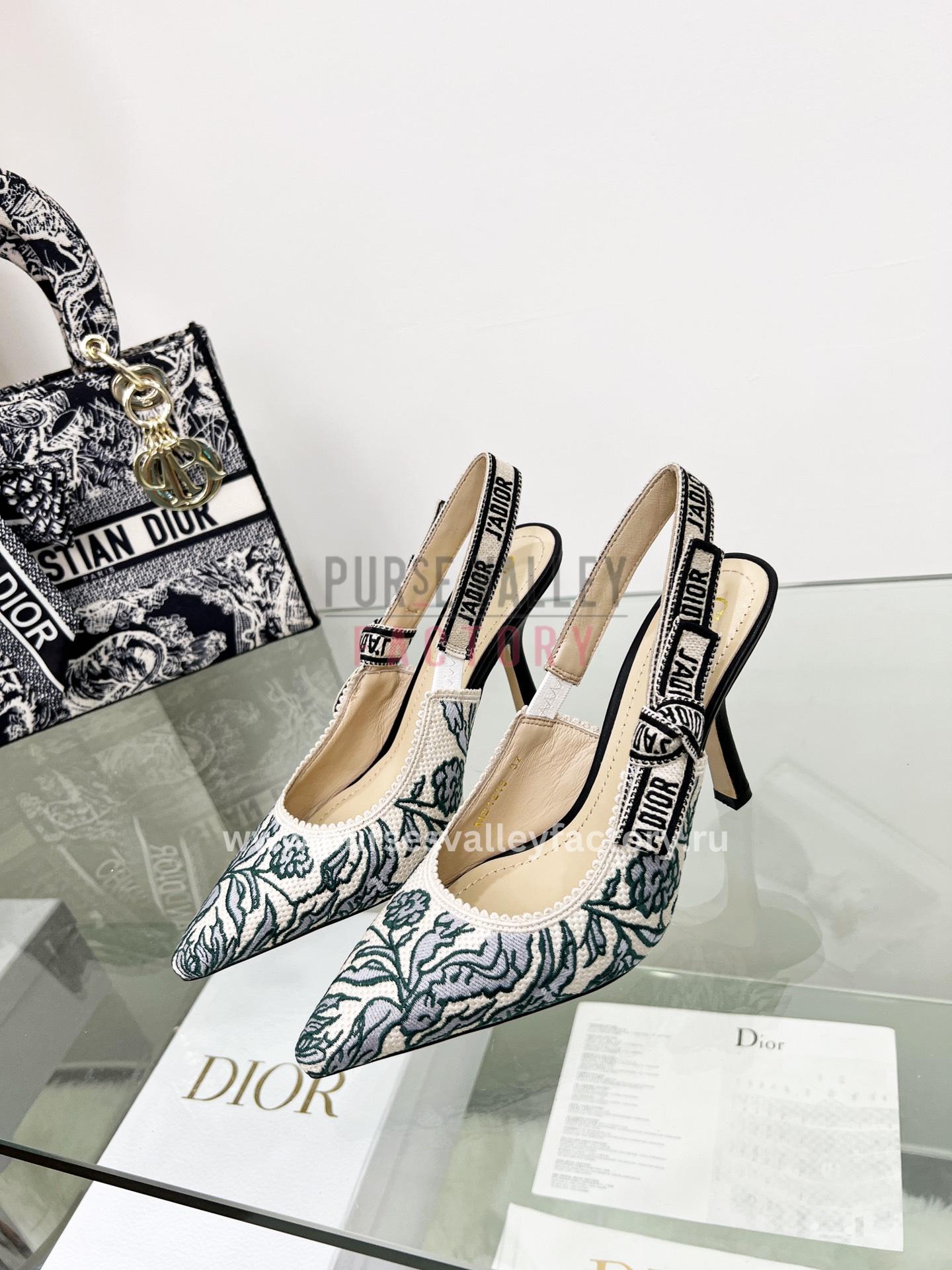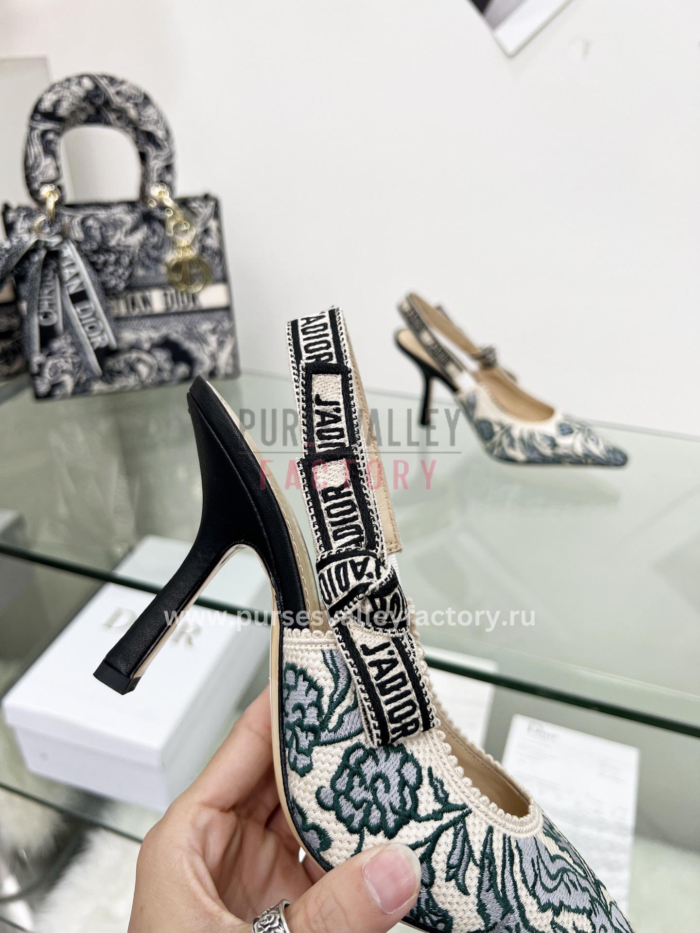 - EXTERIOR: Luxurious green and grey embroidered cotton canvas upper with a black grosgrain trim, a green and grey embroidered /’/J’ADIOR ribbon with a flat bow and a 6.5 cm comma heel.