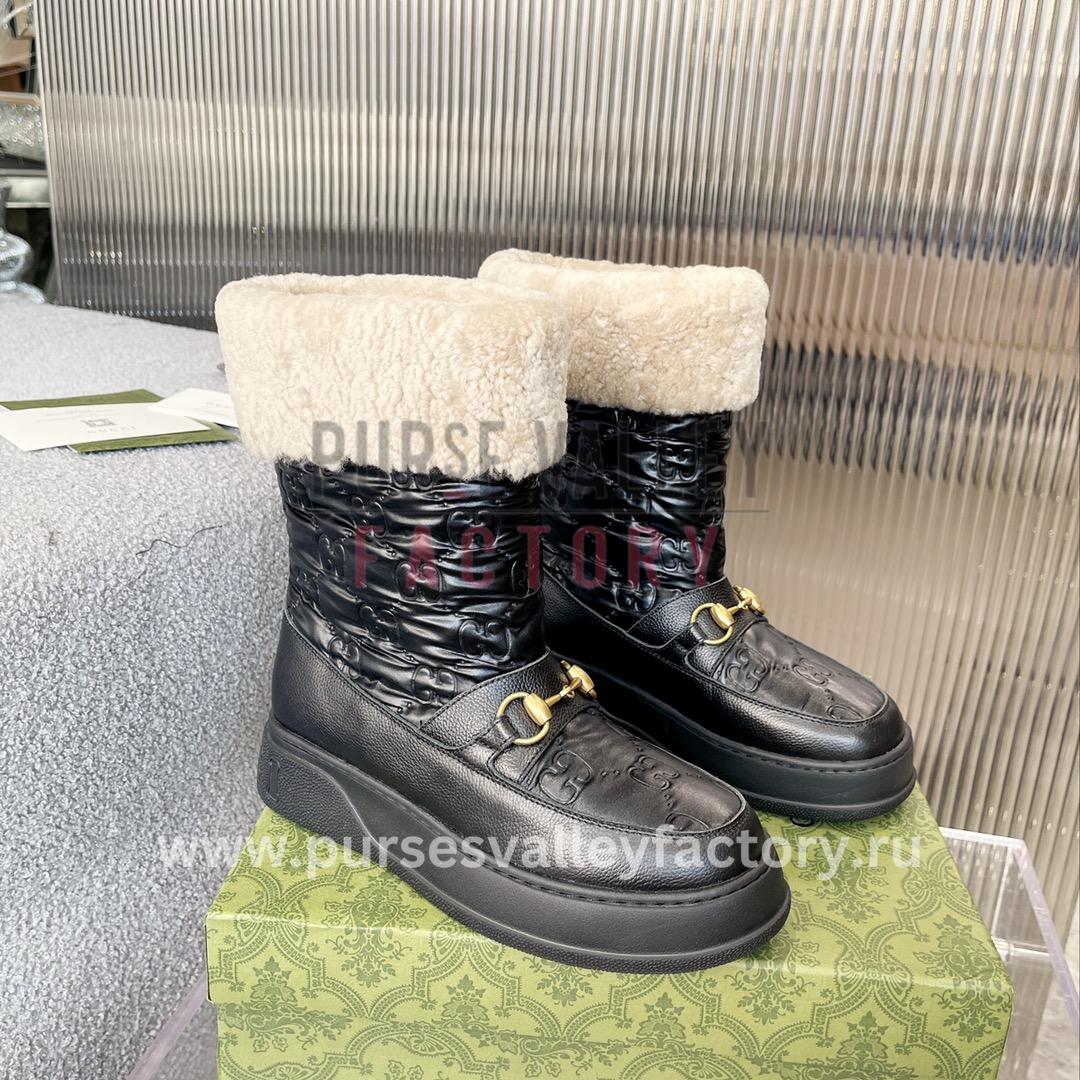 • DESCRIPTION: A pair of beige and ebony GG Supreme canvas ankle boots with a quilted leather detail at the ankle and a rubber lug sole.