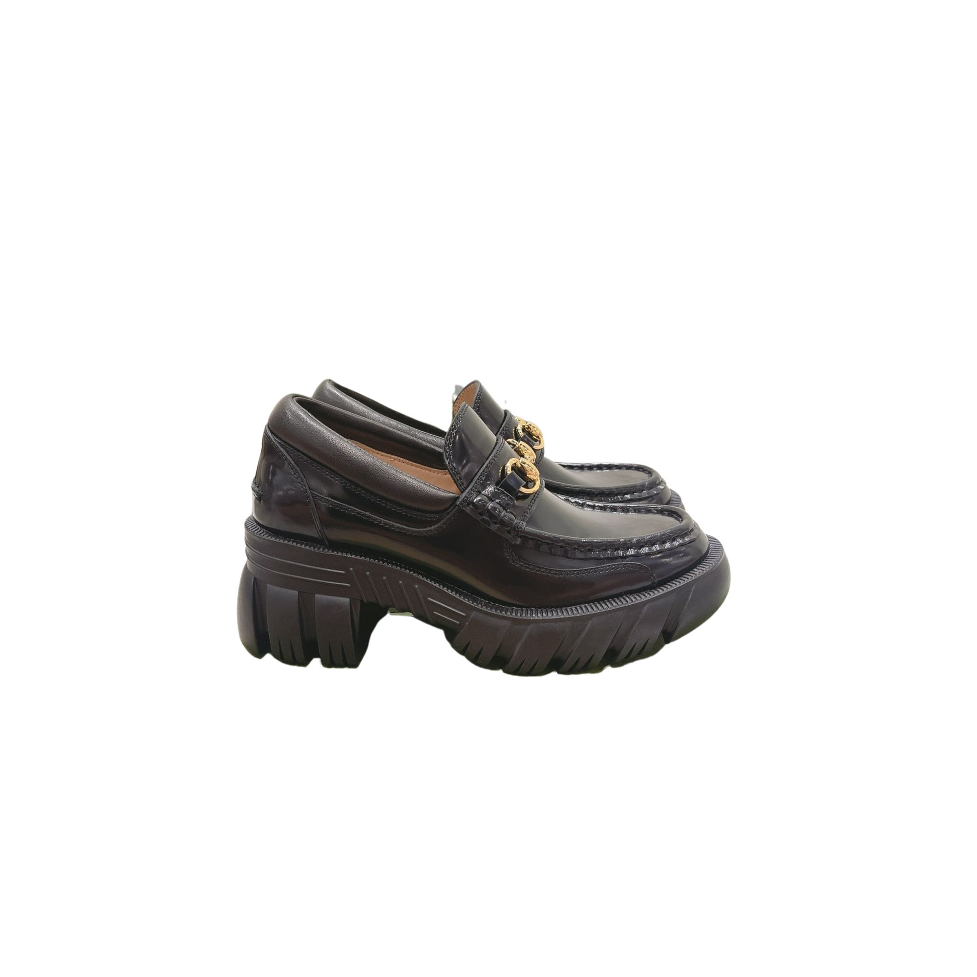• EXTERIOR: Leather upper, chunky lug sole, oversized gold-tone Interlocking G hardware at the vamp, penny loafer strap with gold-tone buckle, tonal stitching.