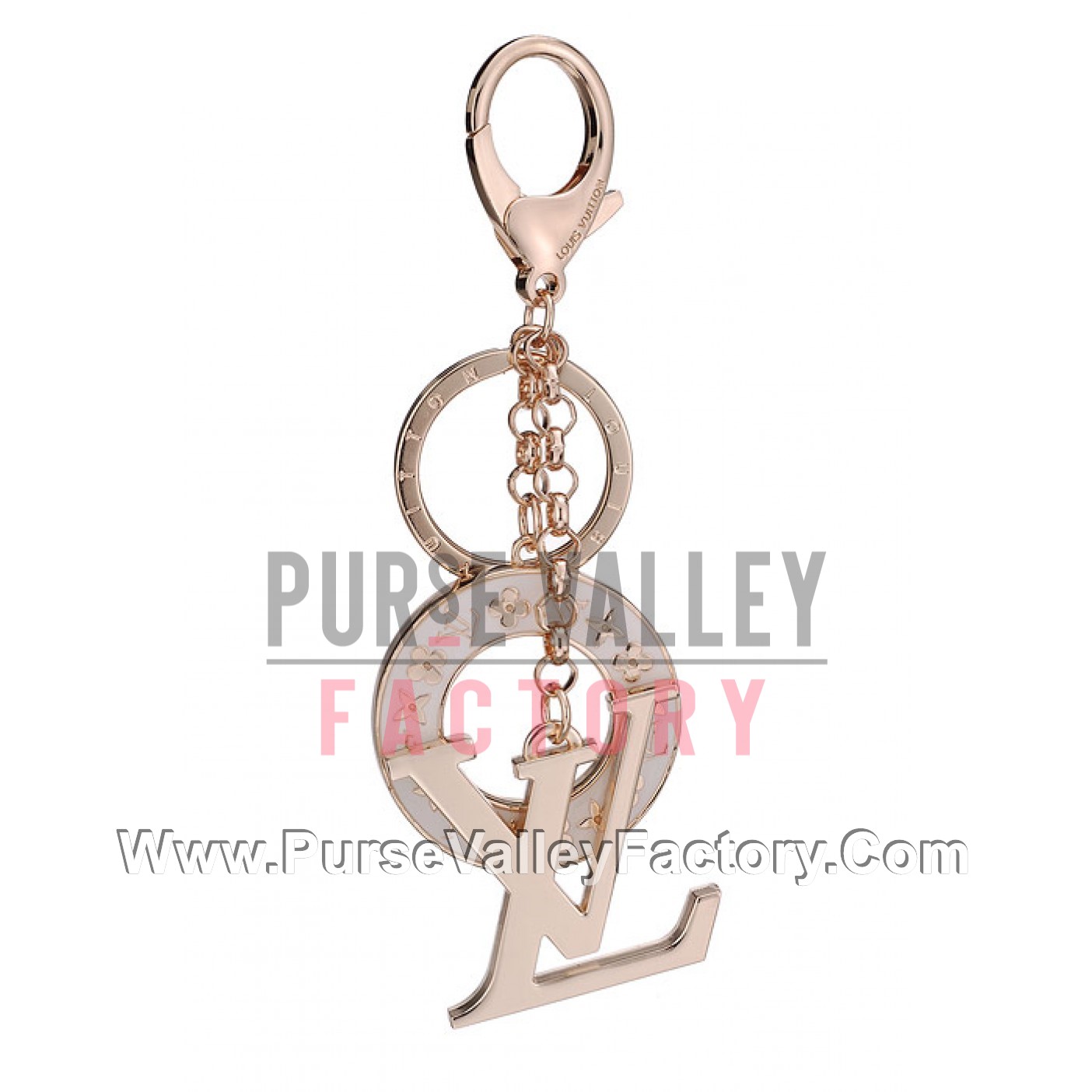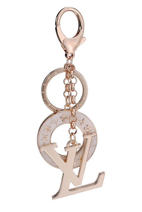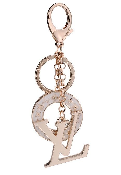 Description Tiny gold LV Monogram are seen embossed on the surface of the white enamel lifebuoy charm while a large LV logo forms a second charm decorating this gold bag charm