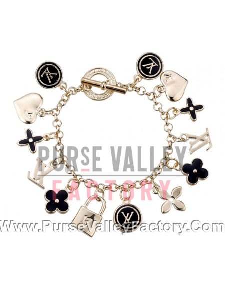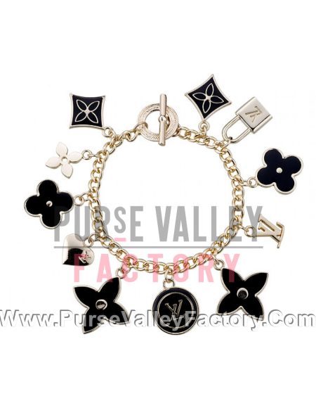Louis Vuitton Replica Black Enameled Classic LV Monogram Gold Charm Bracelet 2165-86