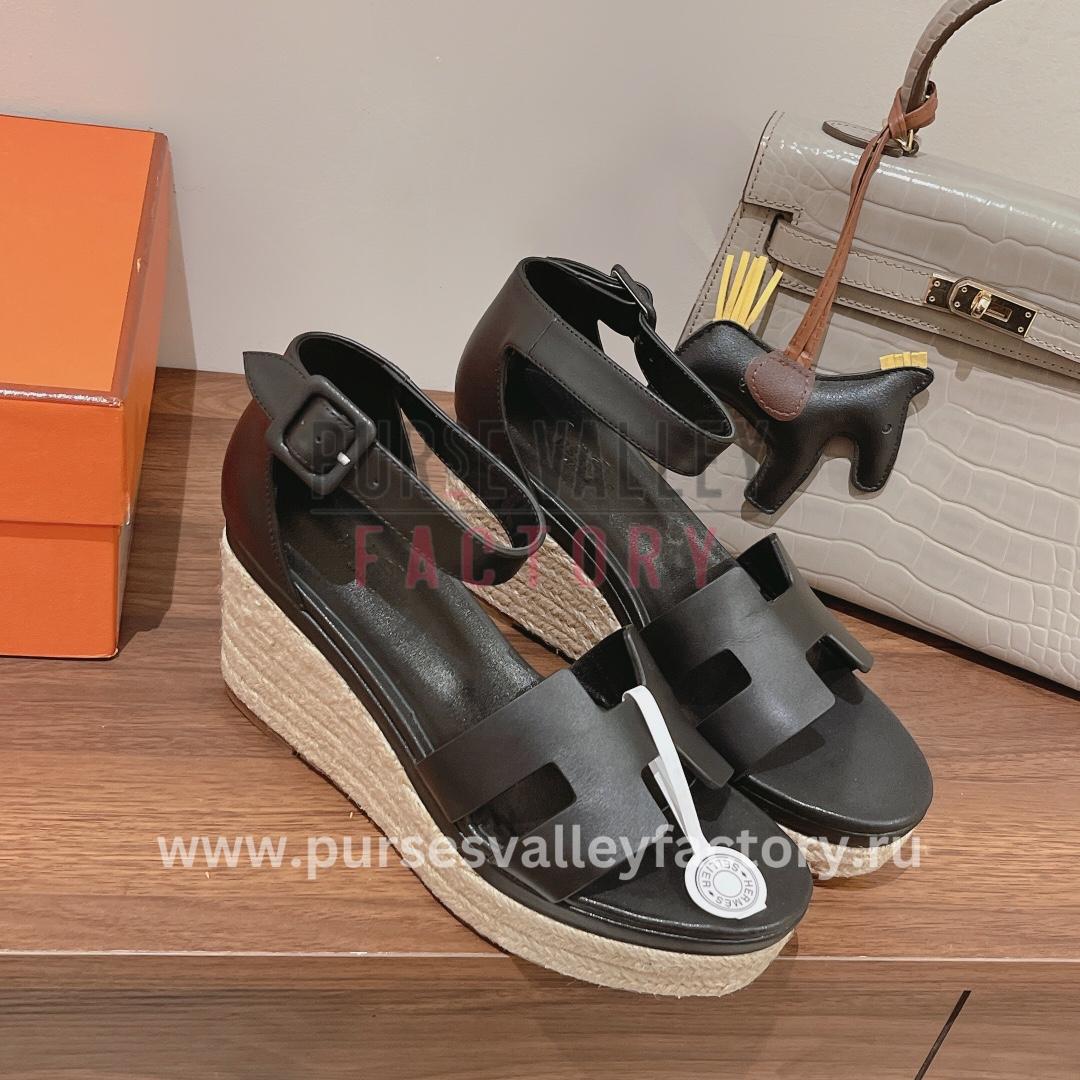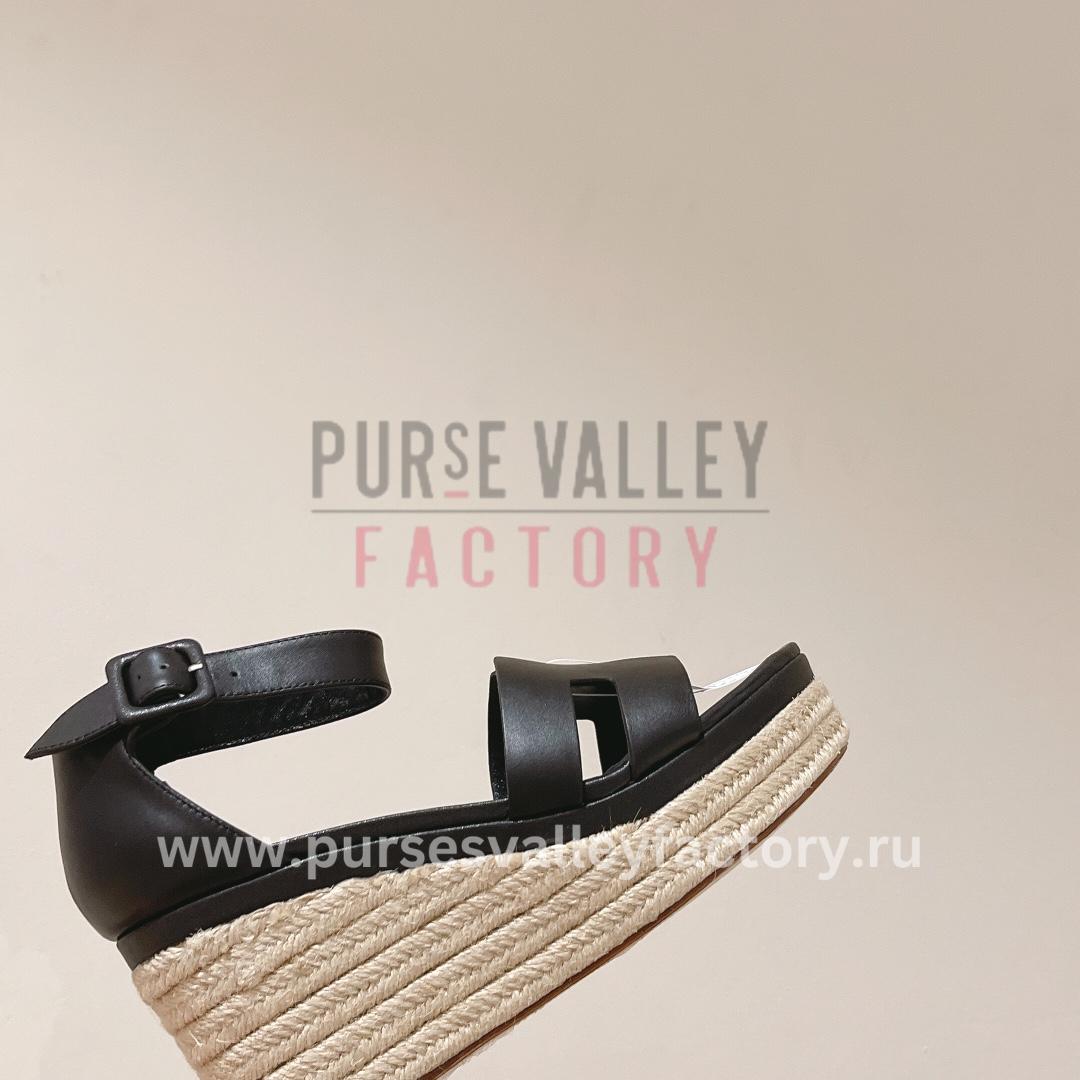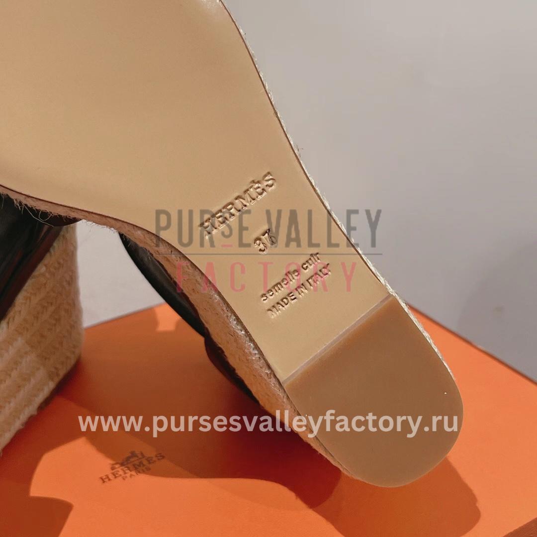 - DESCRIPTION: Step into summer sophistication with the HERMÈS Elda espadrille in crisp black. Crafted from smooth goatskin, this chic wedge sandal features a signature /’/H cutout detail and a braided jute wedge heel for a touch of rustic elegance. The wraparound ankle strap with a delicate buckle closure ensures a secure comfortable fit while the goatskin lining and insole offer breathable luxury. These versatile espadrilles will effortlessly elevate your warm-weather wardrobe from breezy sundresses to cropped jeans.