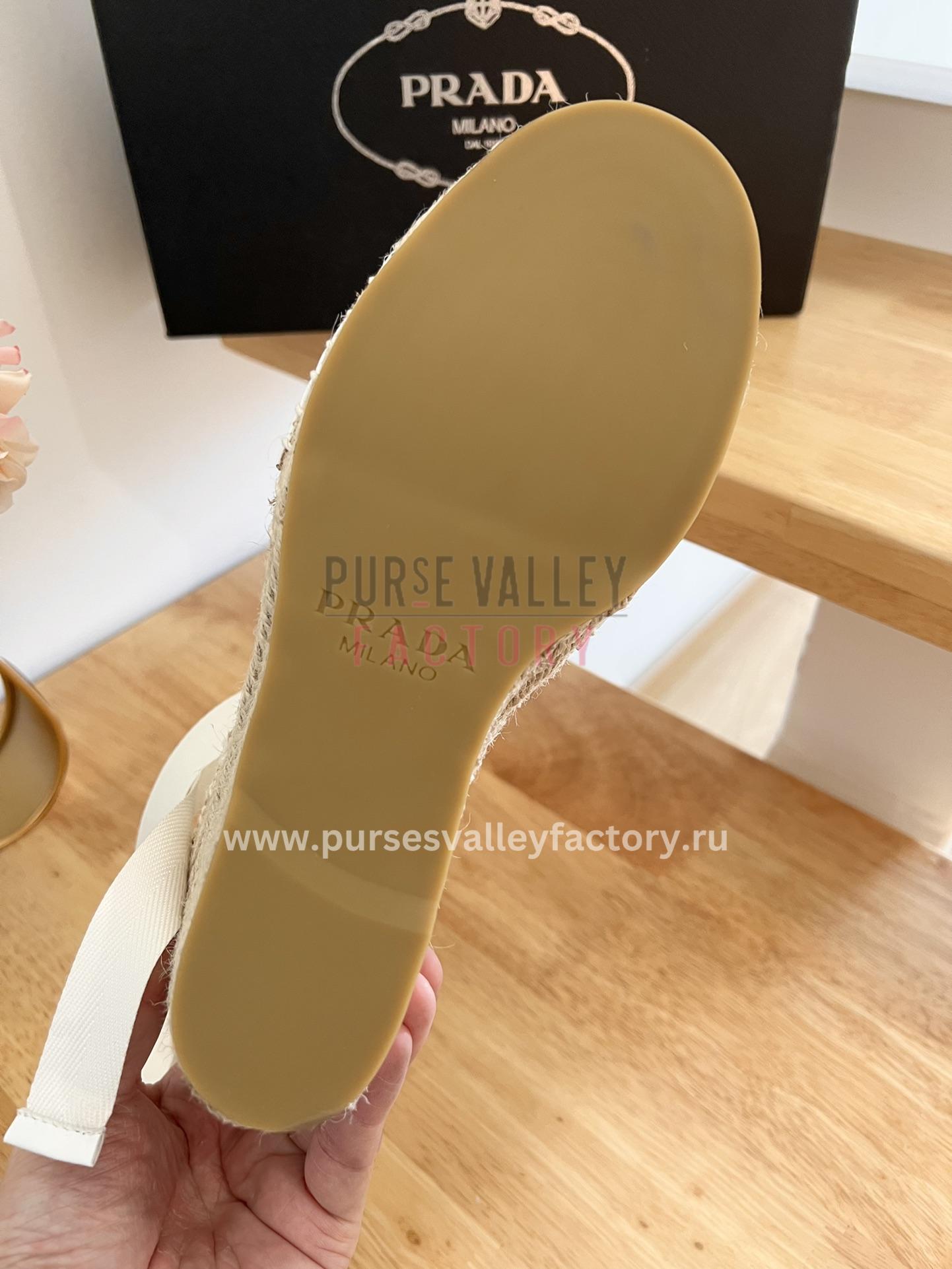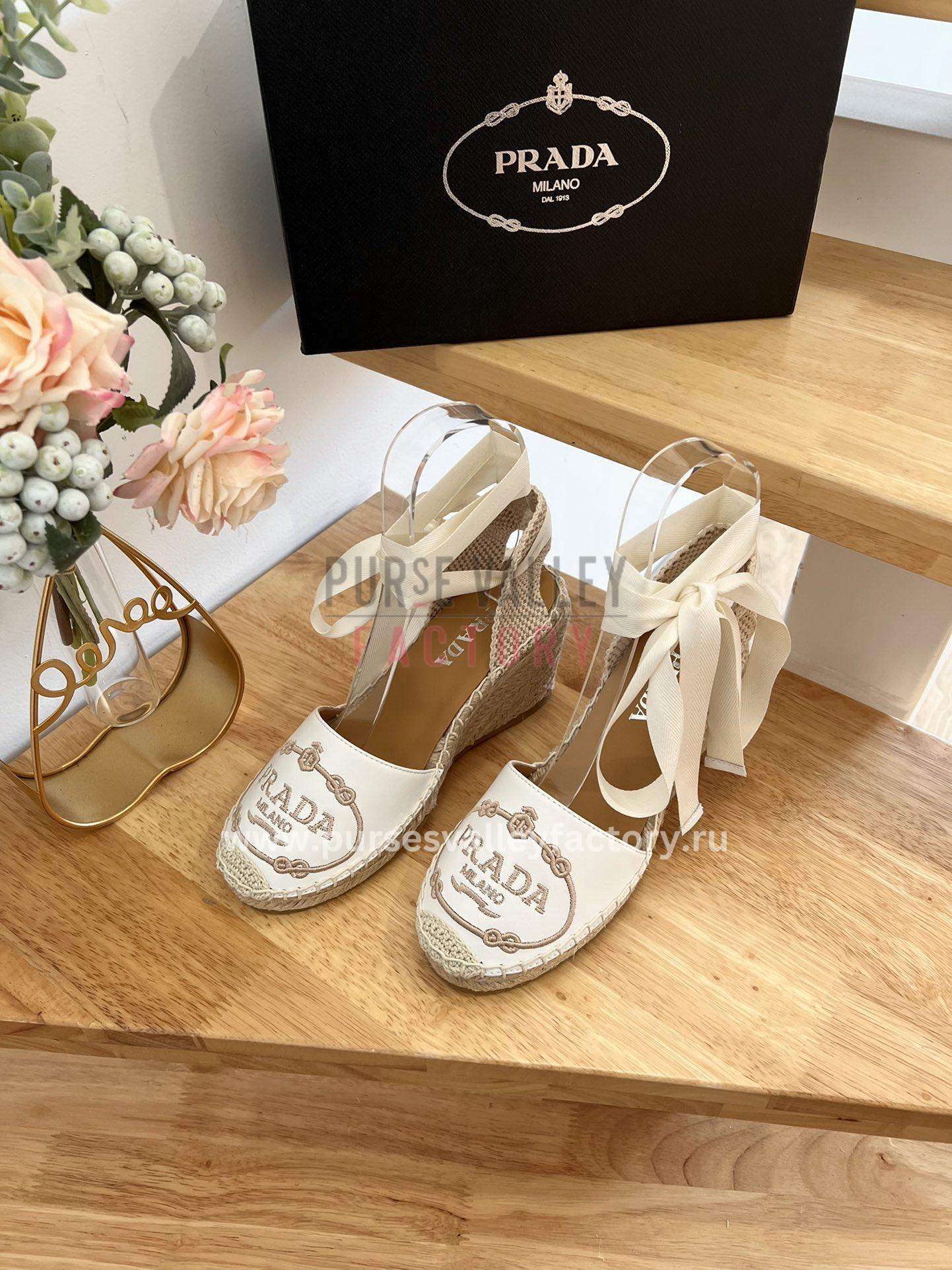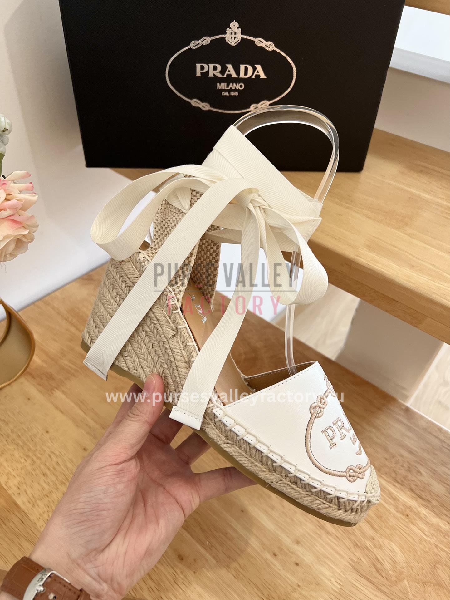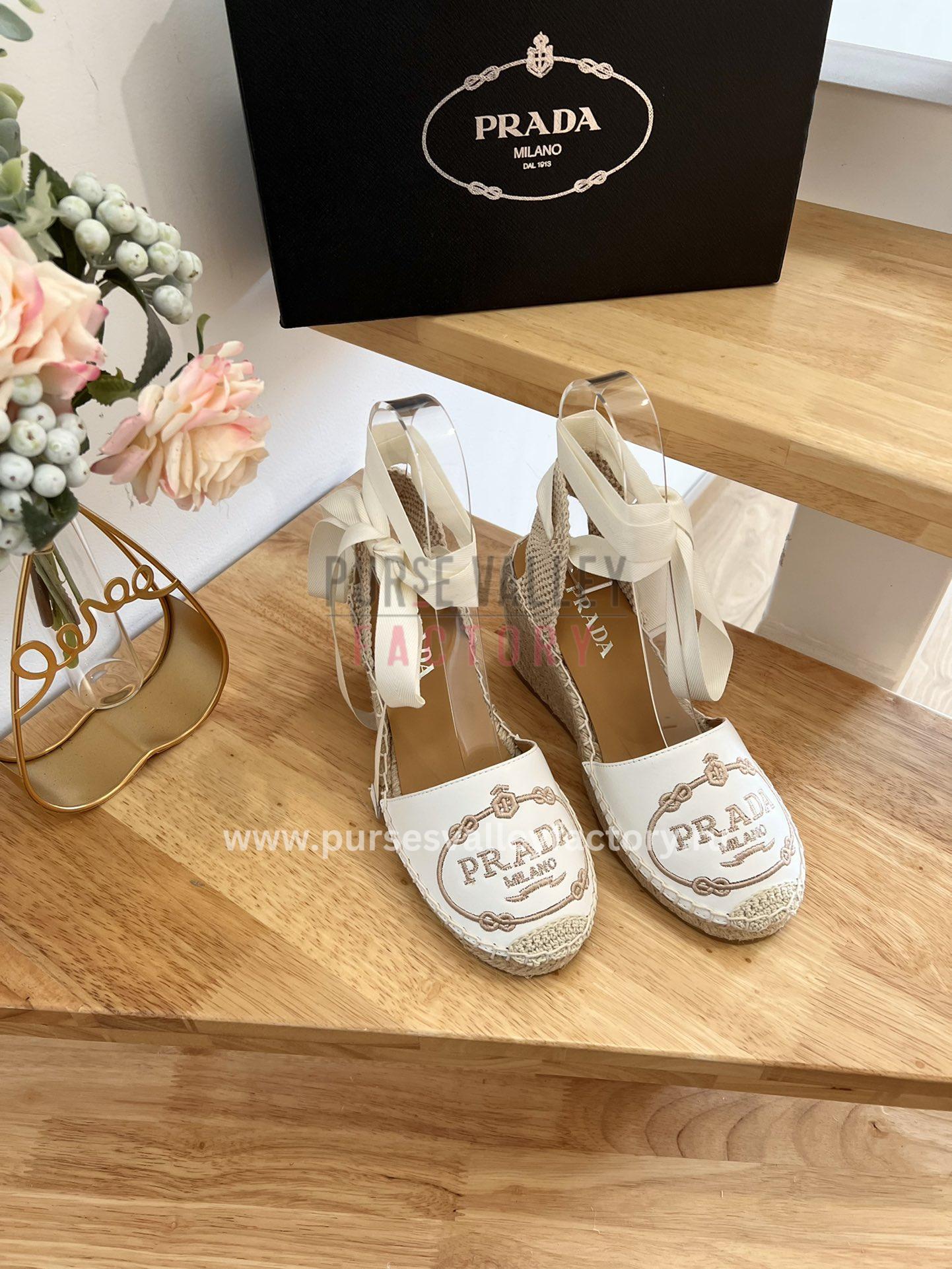 - DESCRIPTION: Step into summer sophistication with these Prada espadrille wedge sandals. Crafted from leather, they feature a timeless silhouette with an elevated wedge heel and chic ankle strap. The iconic Prada logo adds a touch of signature luxury, while the jute and rubber sole ensures both comfort and style.