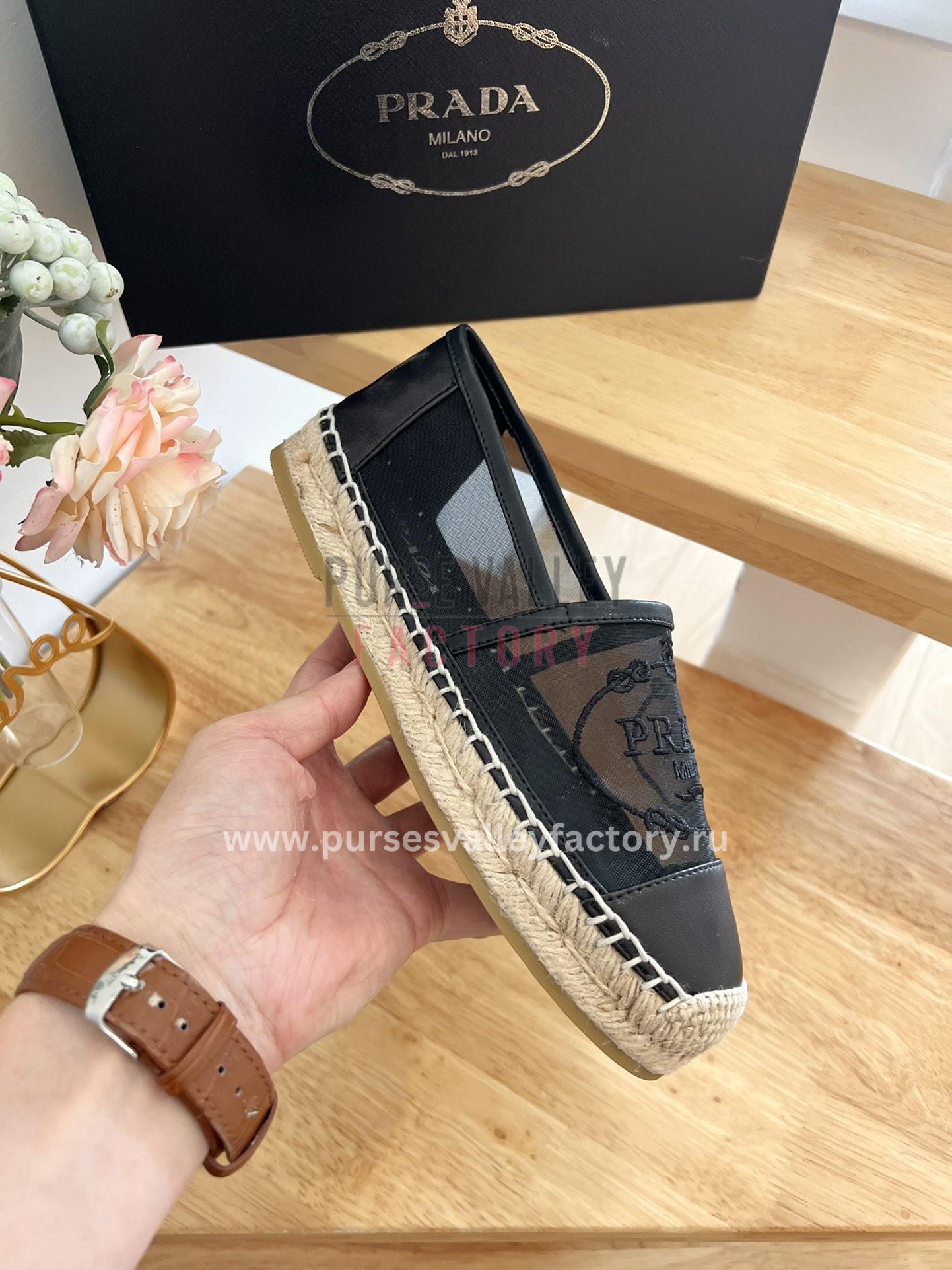 - EXTERIOR: Black linen upper with a jute wedge heel and rubber sole. Prada’s signature enamel triangle logo is prominently displayed on the side.