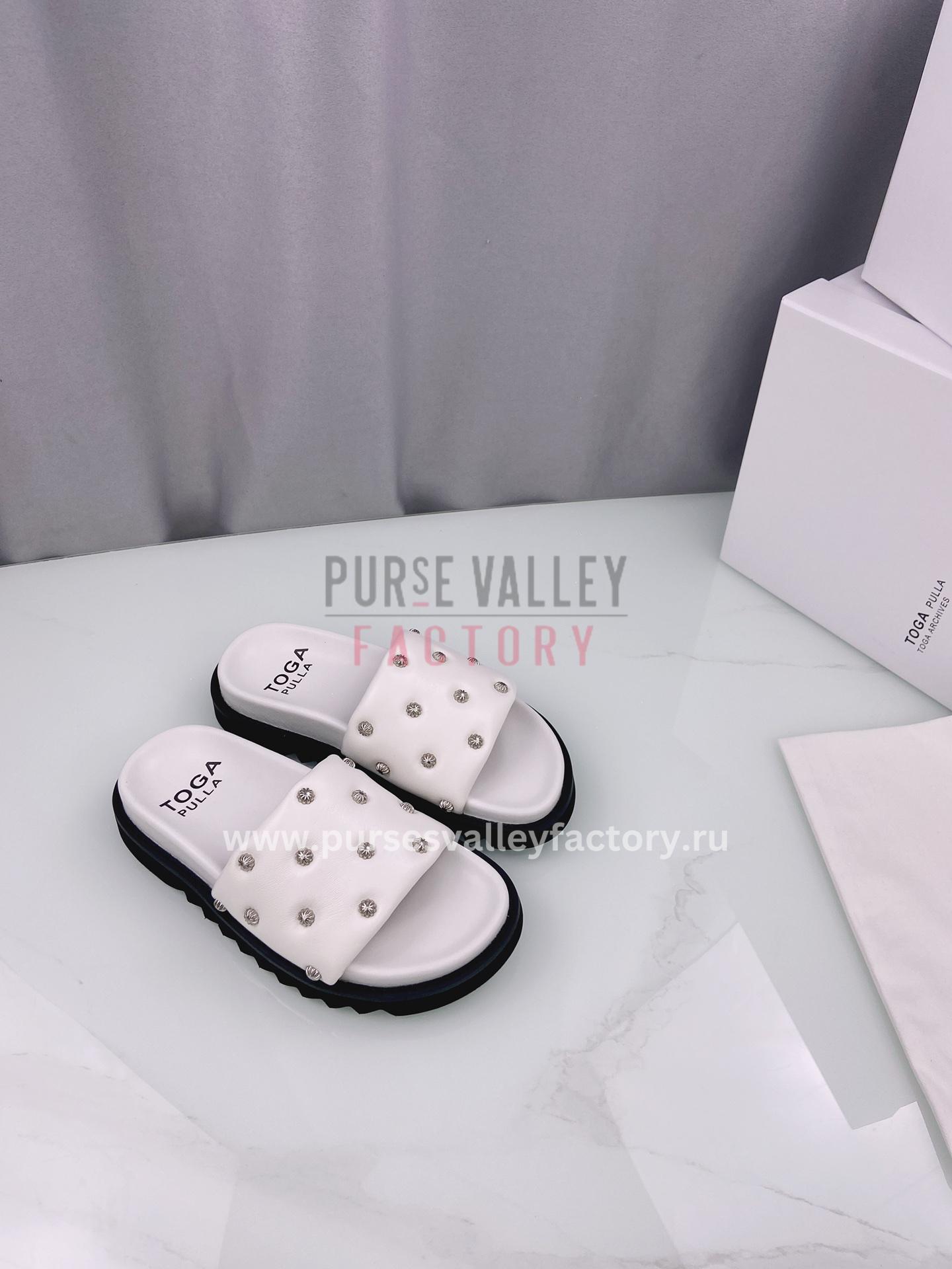 - EXTERIOR: Elevate your everyday style with the Toga Pulla Flatform Slides in White. Crafted from supple nappa leather in a pristine white hue.