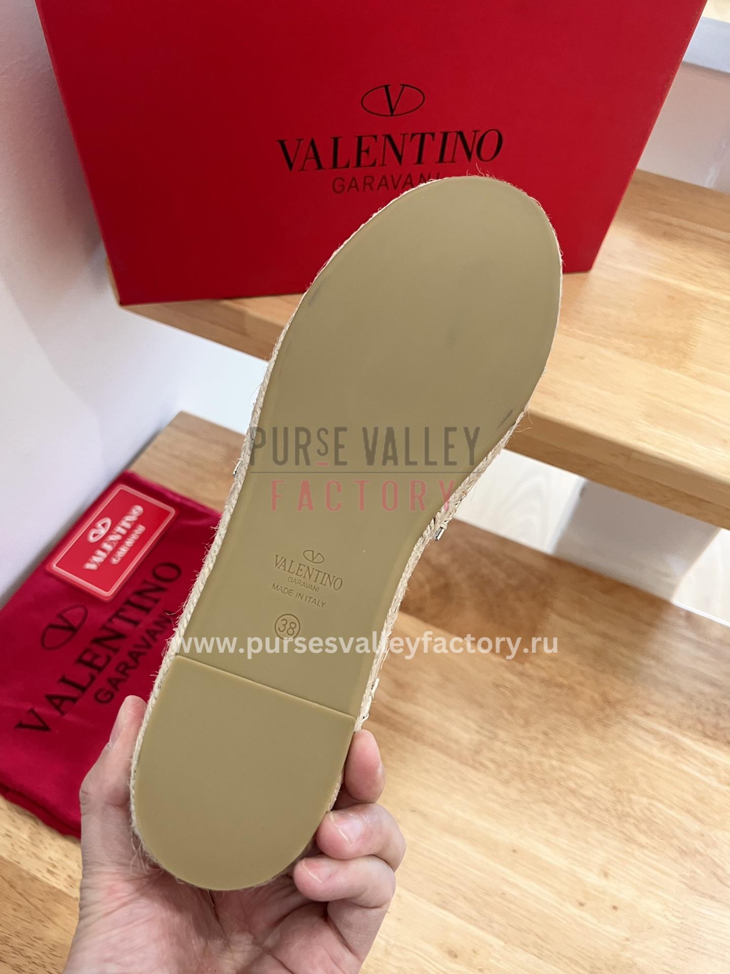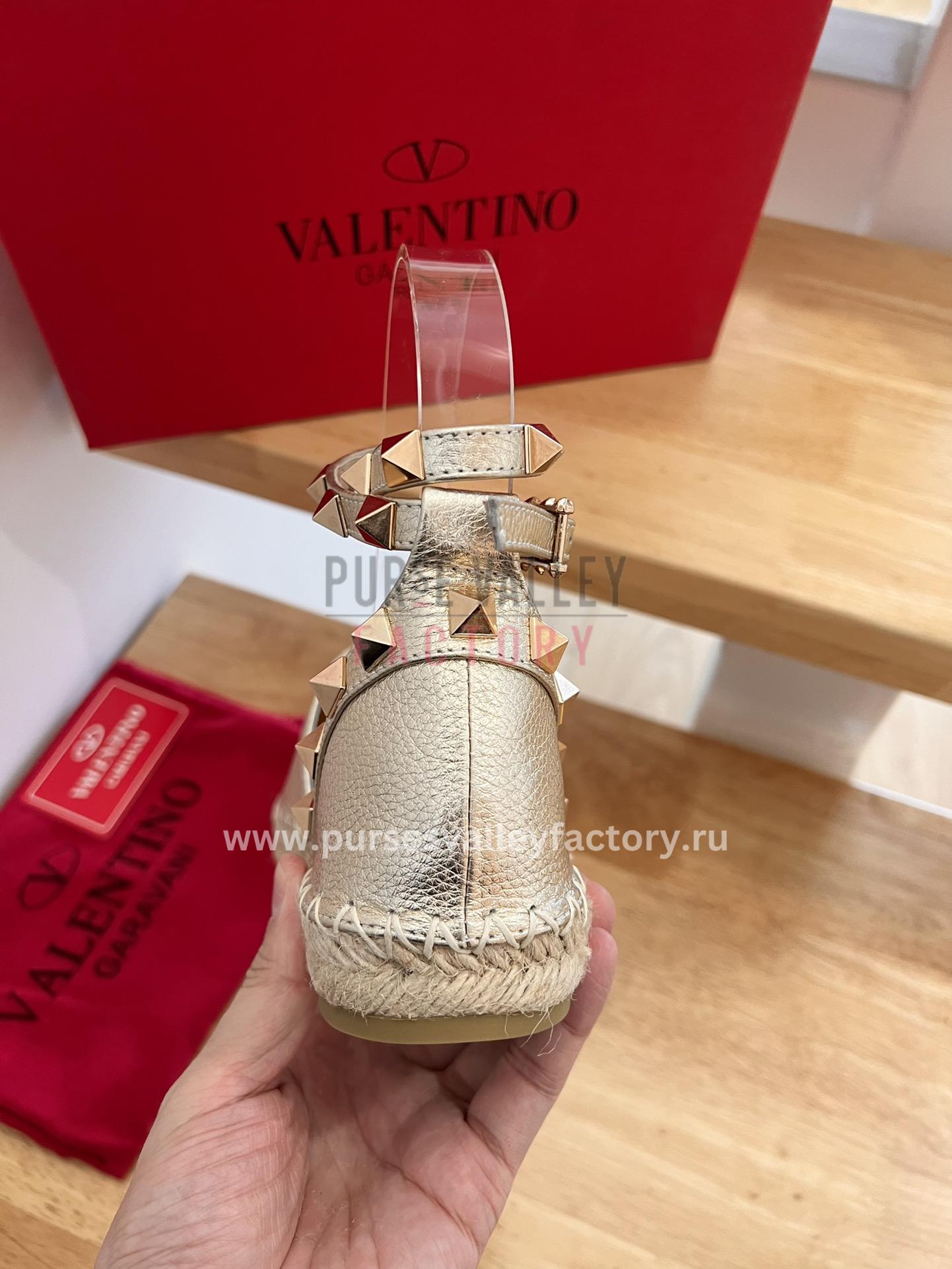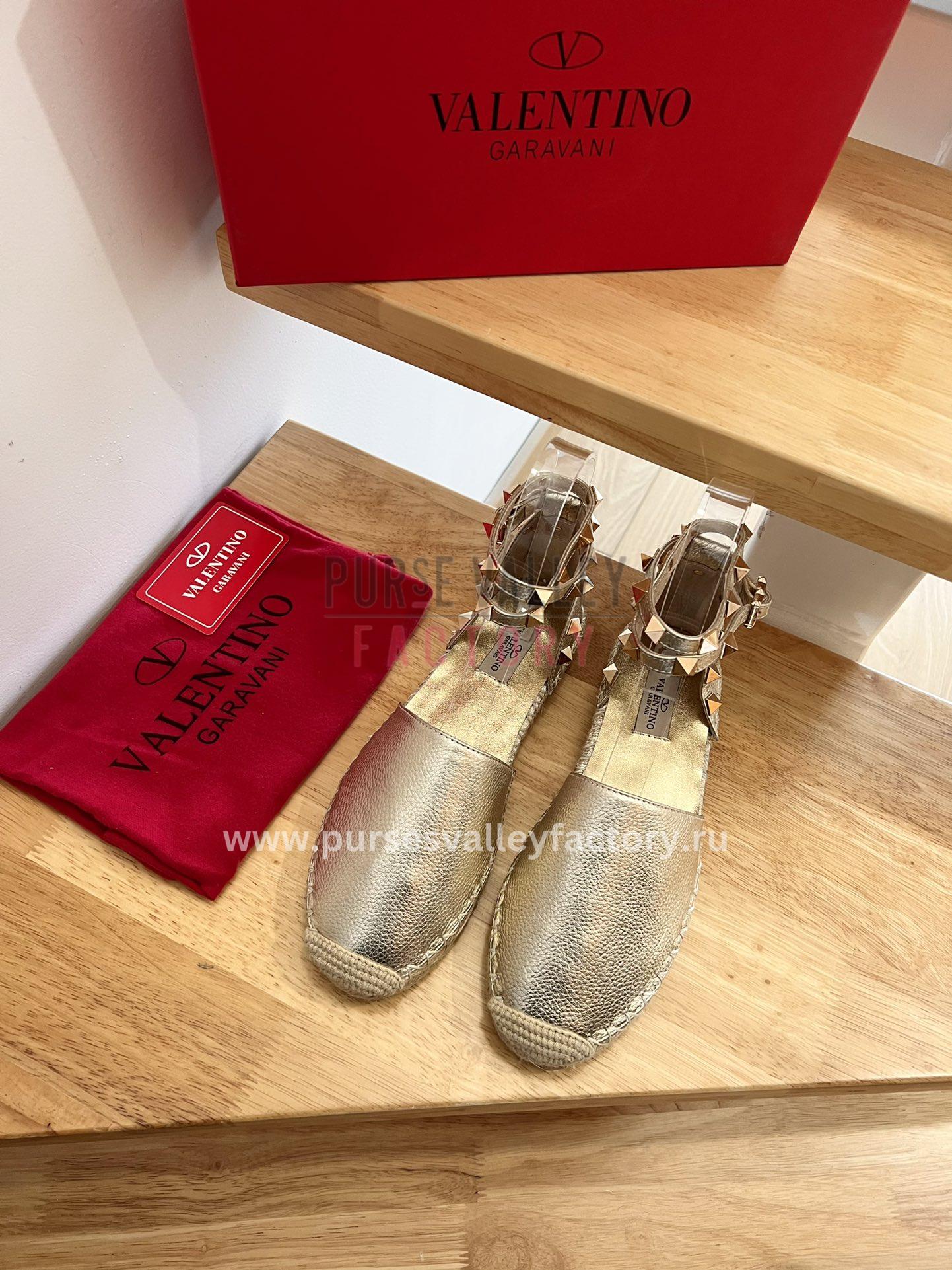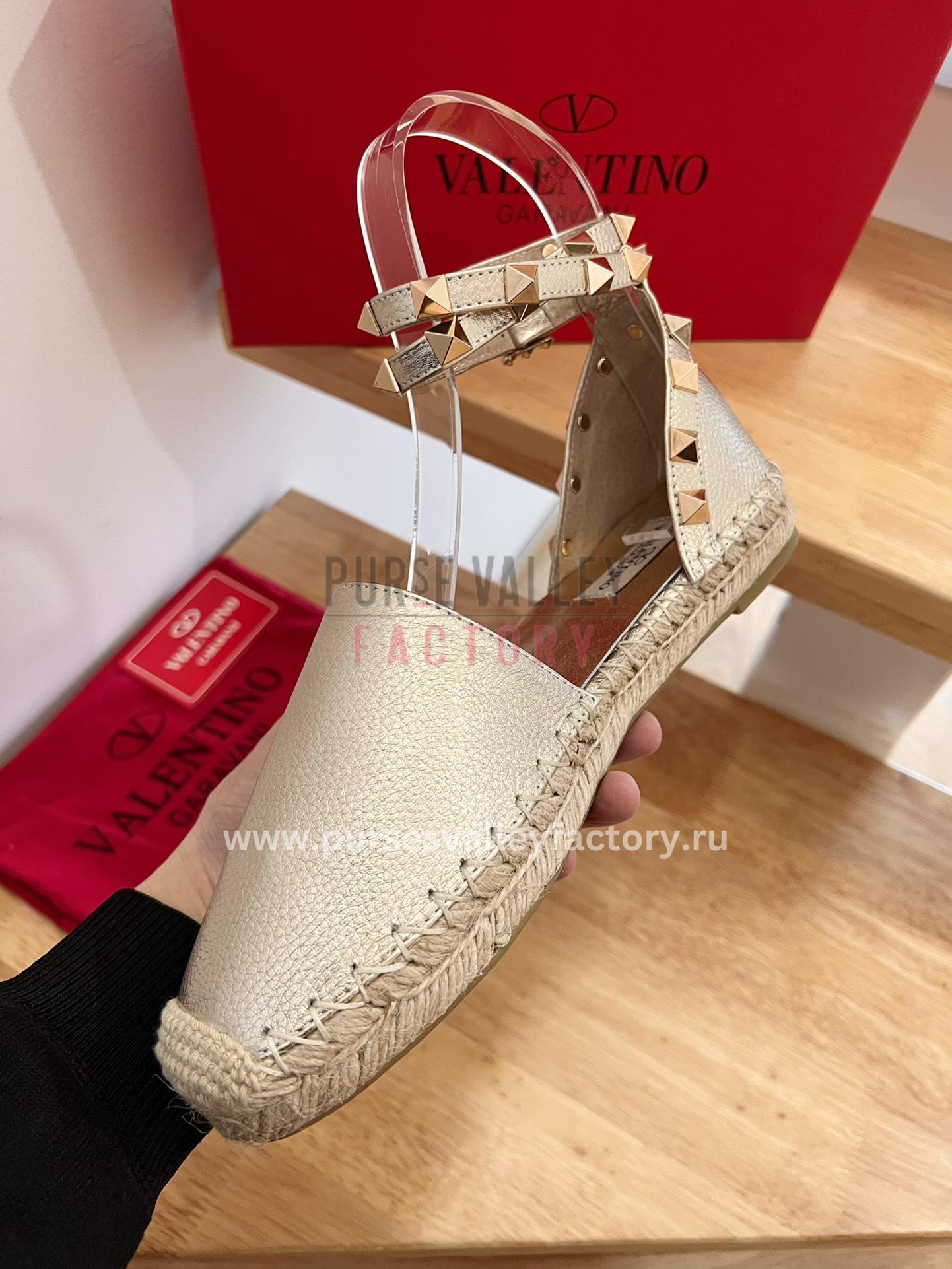 • DESCRIPTION: These sleek and stylish espadrilles from Valentino Garavani are the perfect way to add a touch of luxury to your summer wardrobe. Made from rich Gold leather, they feature a classic espadrille silhouette with a closed toe and lace-up closure. The soles are crafted from jute and rubber, providing both comfort and durability. The Valentino Garavani logo is embossed on the heel for a touch of designer flair.