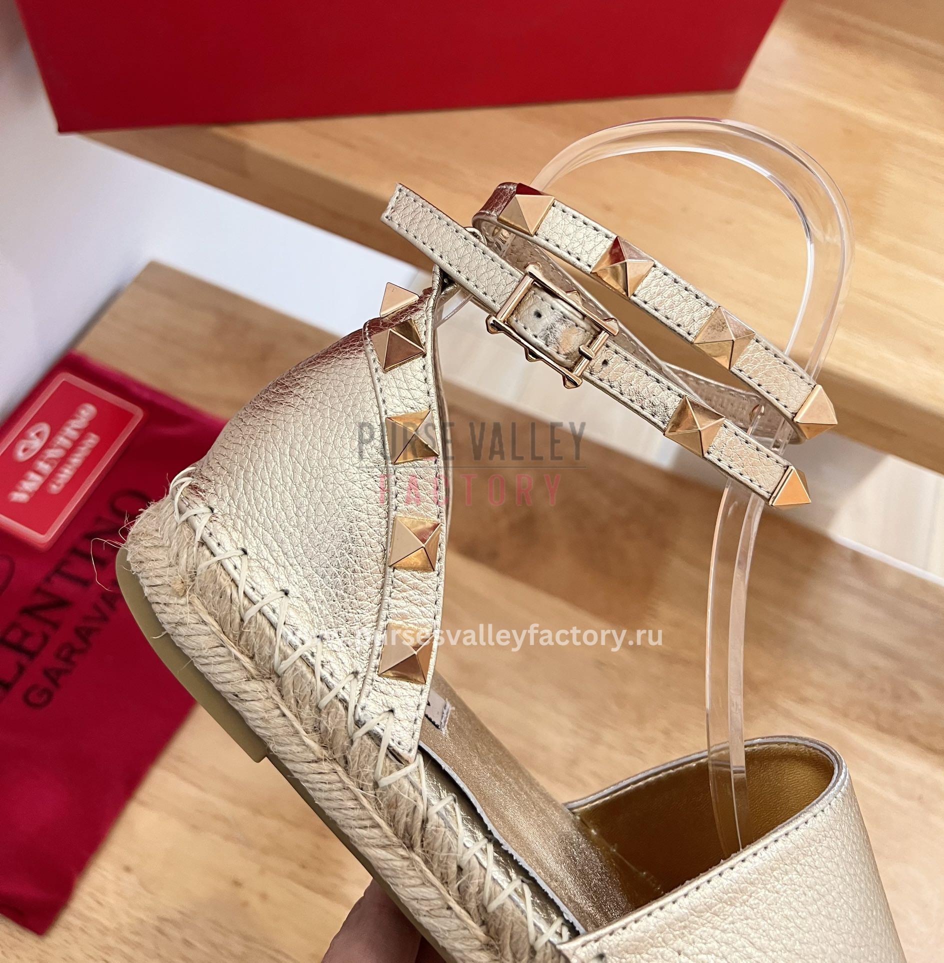 • EXTERIOR: Gold leather upper jute and rubber sole, Valentino Garavani logo embossed on heel