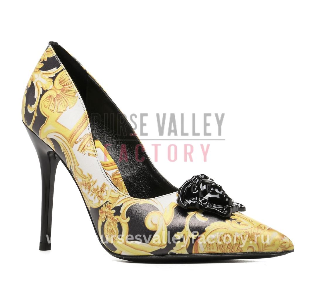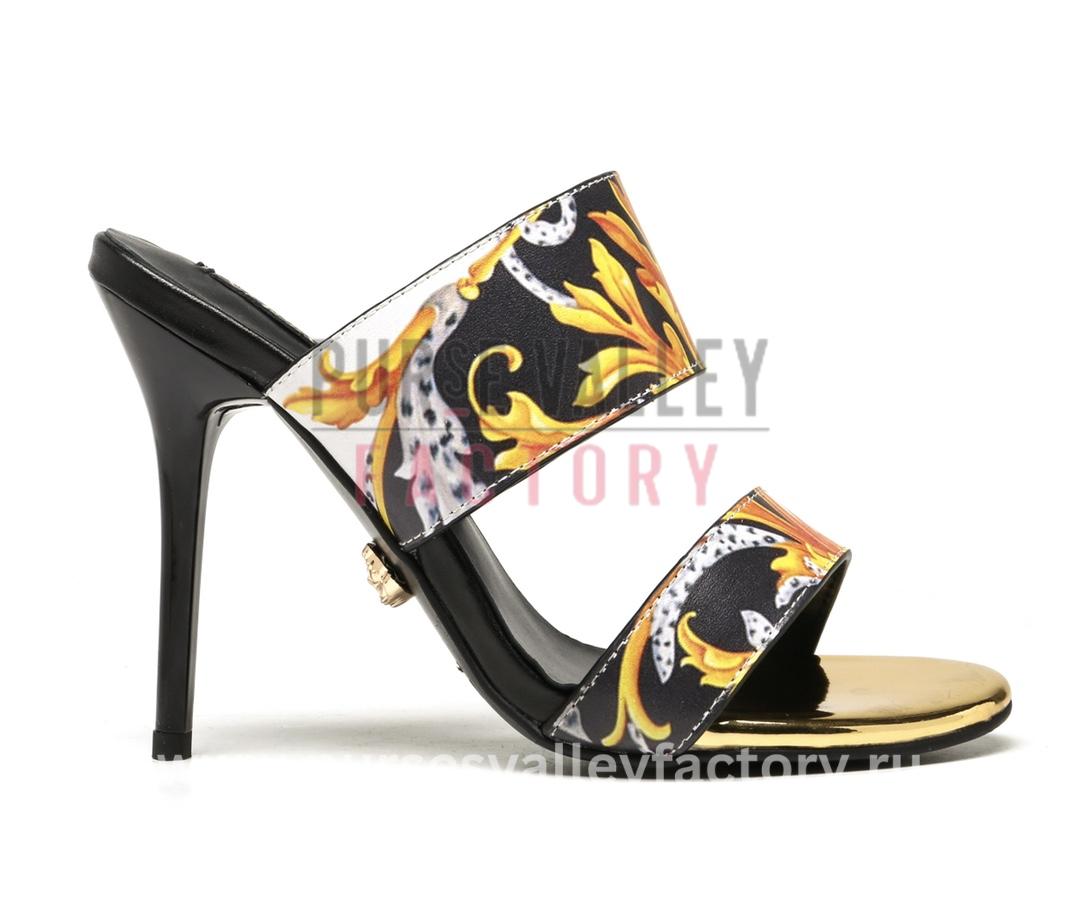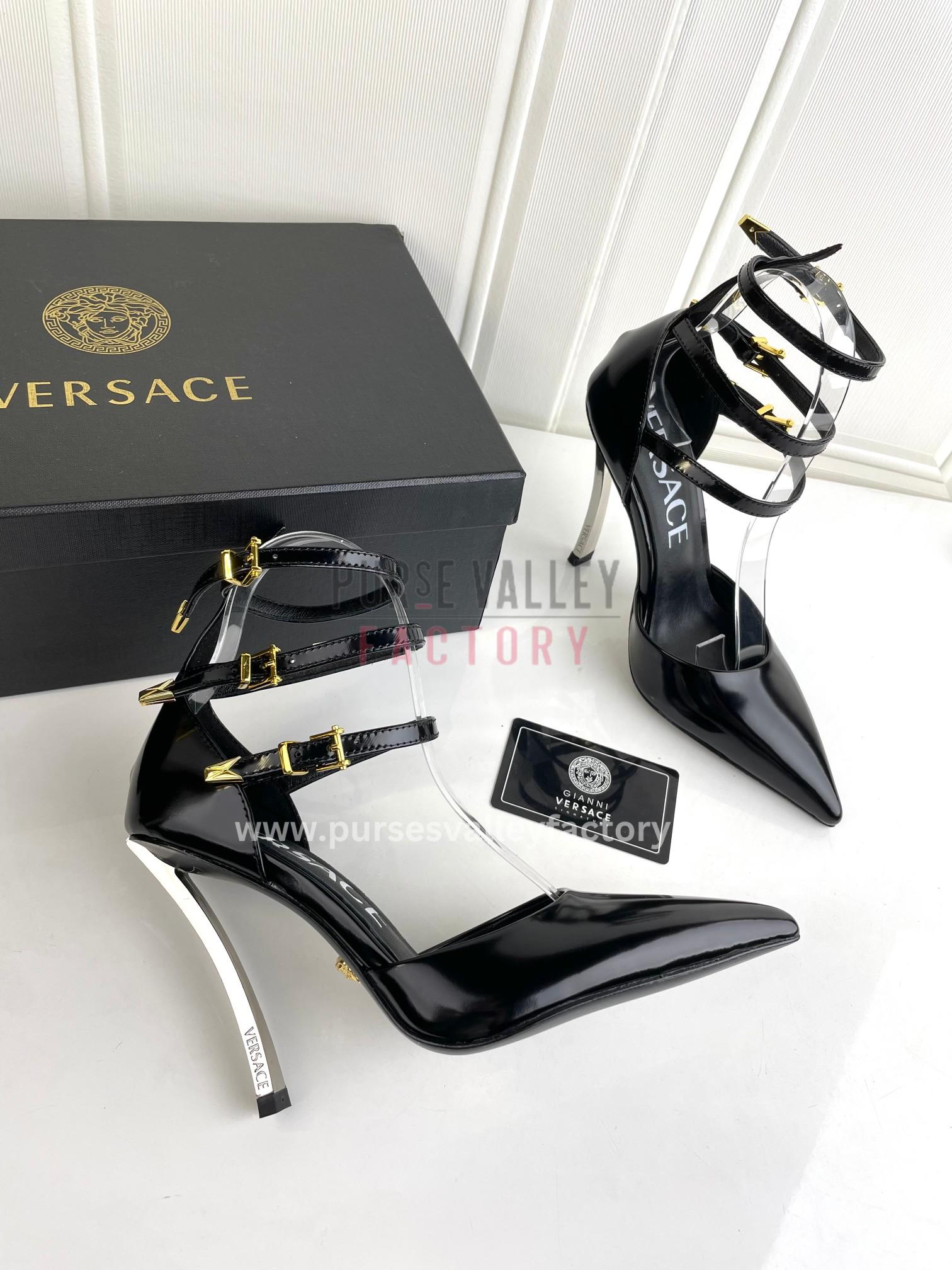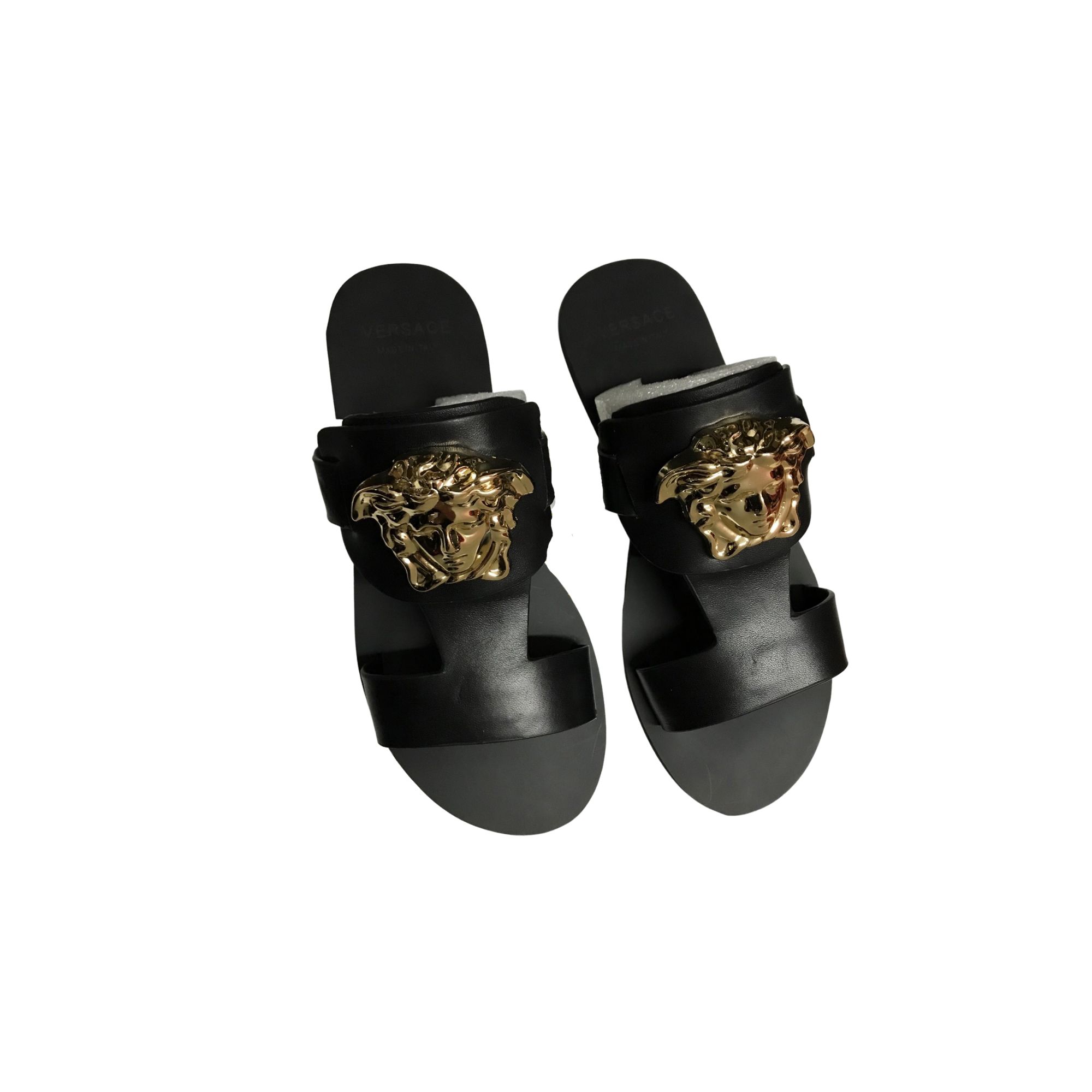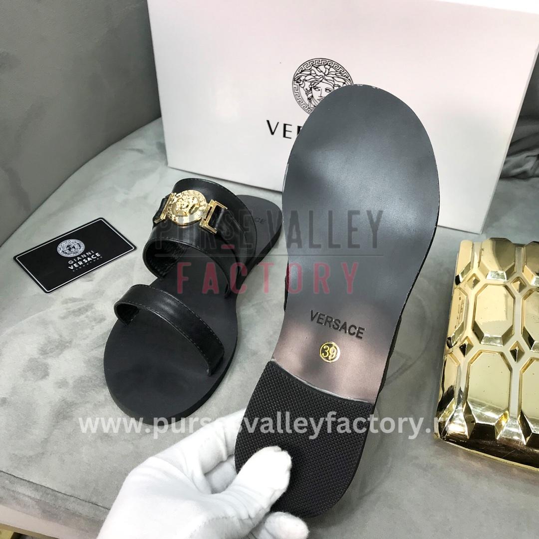 - DESCRIPTION: These stunning Versace sandals are the epitome of luxury footwear. Crafted from a combination of smooth Black leather and sparkling silver Medusa accents, they’re sure to turn heads wherever you go. The sleek stiletto heel adds a touch of glamour, while the comfortable padded insole ensures you can dance the night away in style.