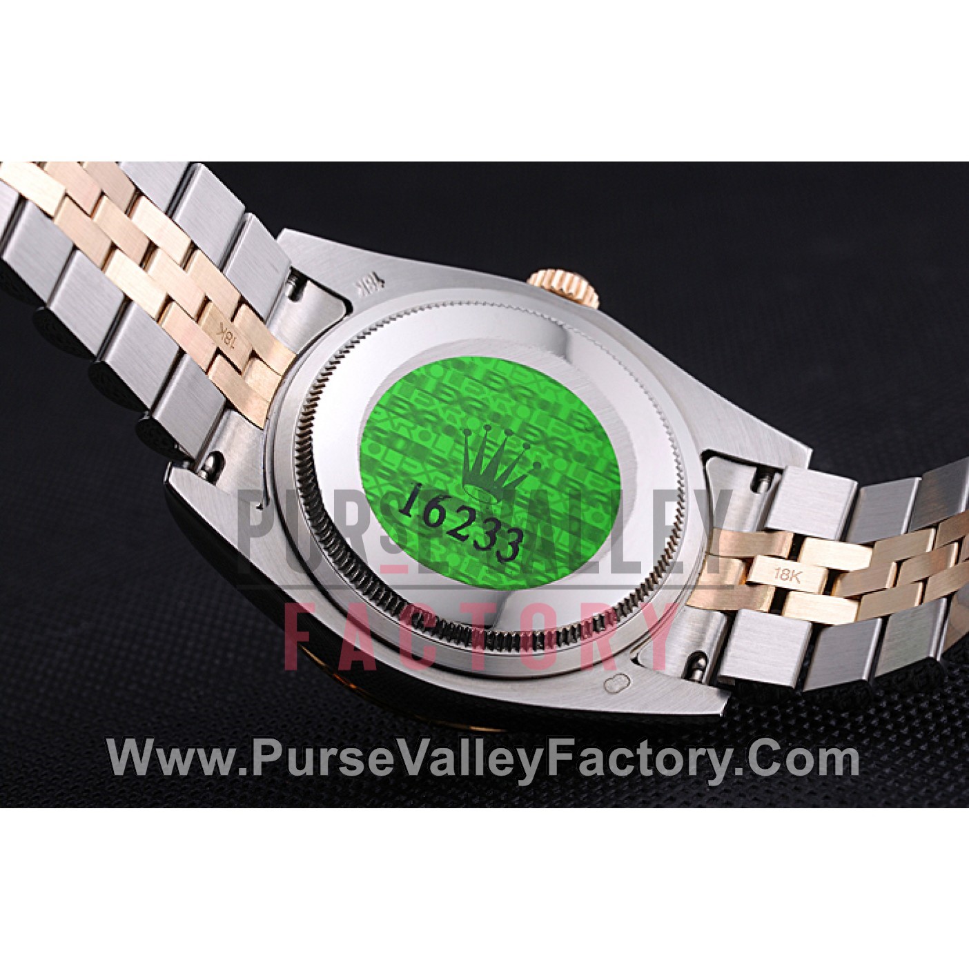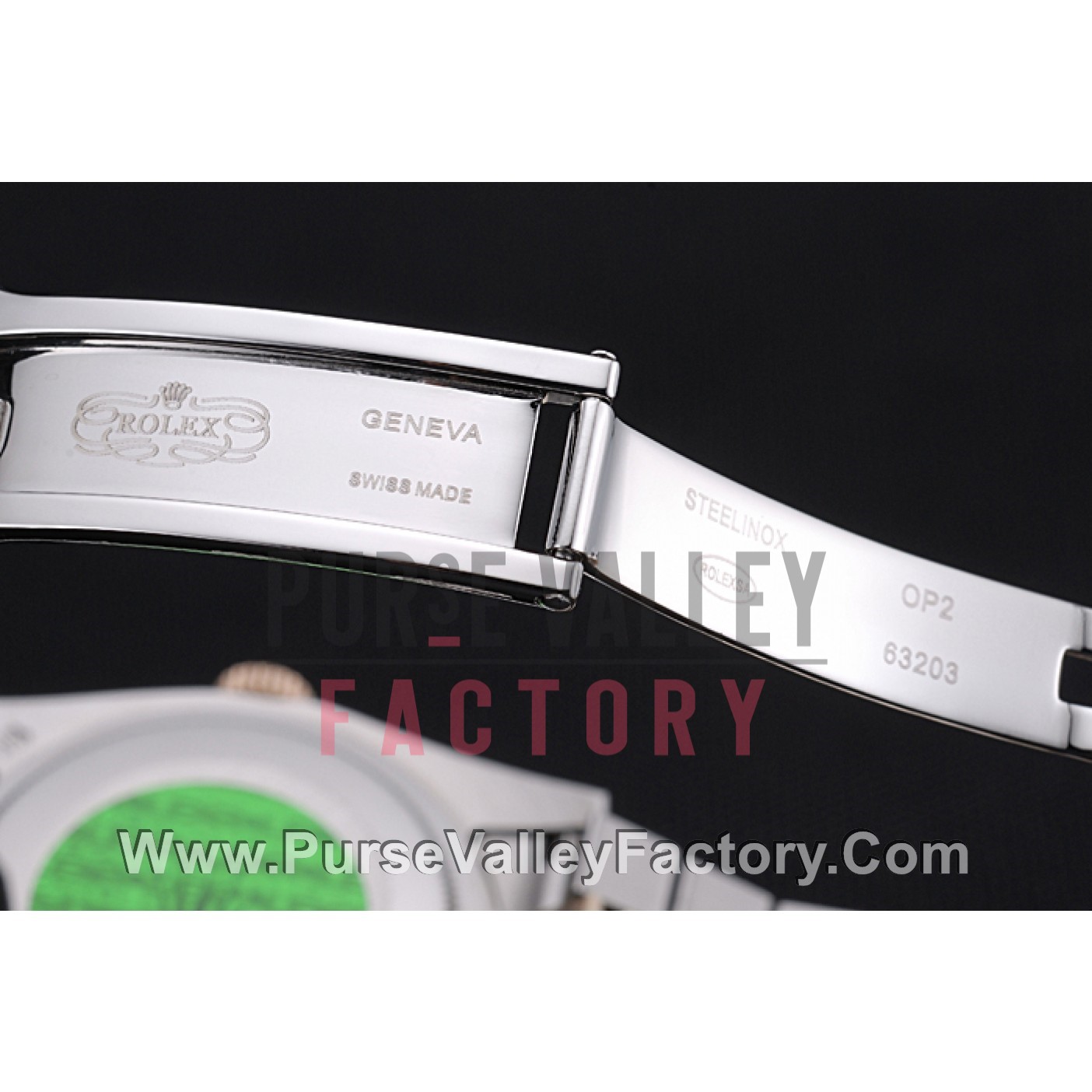 BackPush in stainless steel back with green Rolex sticker and markings